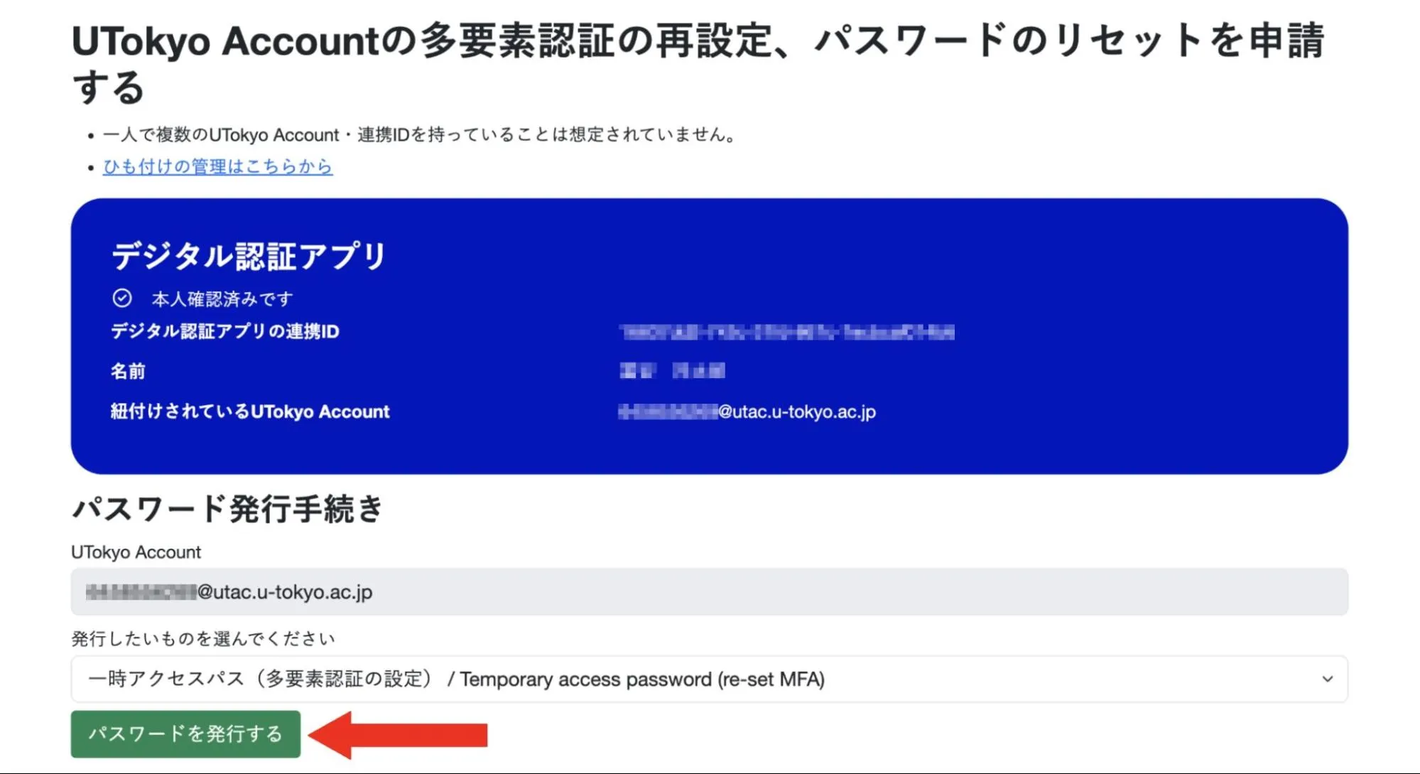 「UTokyo Accountの多要素認証の再設定、パスワードのリセットを申請する」を押してください.