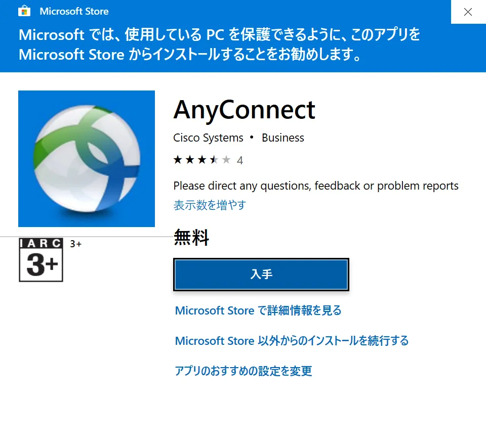その後はダウンロードしたインストーラを開き,他のWindows用アプリケーションと同様にインストールします.もし以下のようなMicrosoft Storeの画面が開いたら,「Microsoft Store 以外からのインストールを続行する」を選択してください.