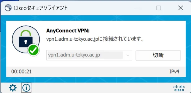 手順H: 再度Cisco Secure Clientをクリックし,現在の状態を確認します.表示された画面で,以下のように「vpn1.adm.u-tokyo.ac.jpに接続されています」と表示されていれば,お使いの機器はUTokyo VPNに接続している状態です.