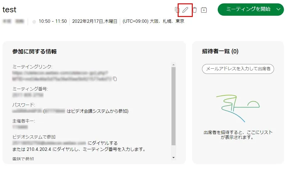 - 出席者に入力していない出席者にも,表示されたミーティングリンク・ミーティング番号・パスワード等をメールで周知することができます.主催者キーは,主催者のみが知るべき番号なので,一般の出席者には周知すべきではありません.