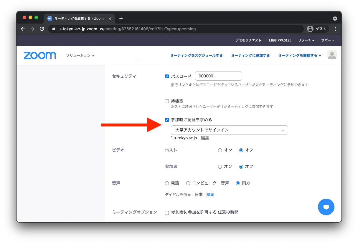 3. 「セキュリティ」の中にある「参加時に認証を求める」から設定を行います.オンにした上で「大学アカウントでサインイン」を選択すると,東京大学の Zoom アカウントでサインインしないと入室できないようになります.オンにする場合は,「大学アカウントでサインイン」の下に表示されるドメインが *.u-tokyo.ac.jp であることを確認してください(異なる場合は「編集」を押して *.u-tokyo.ac.jp に変更してください).